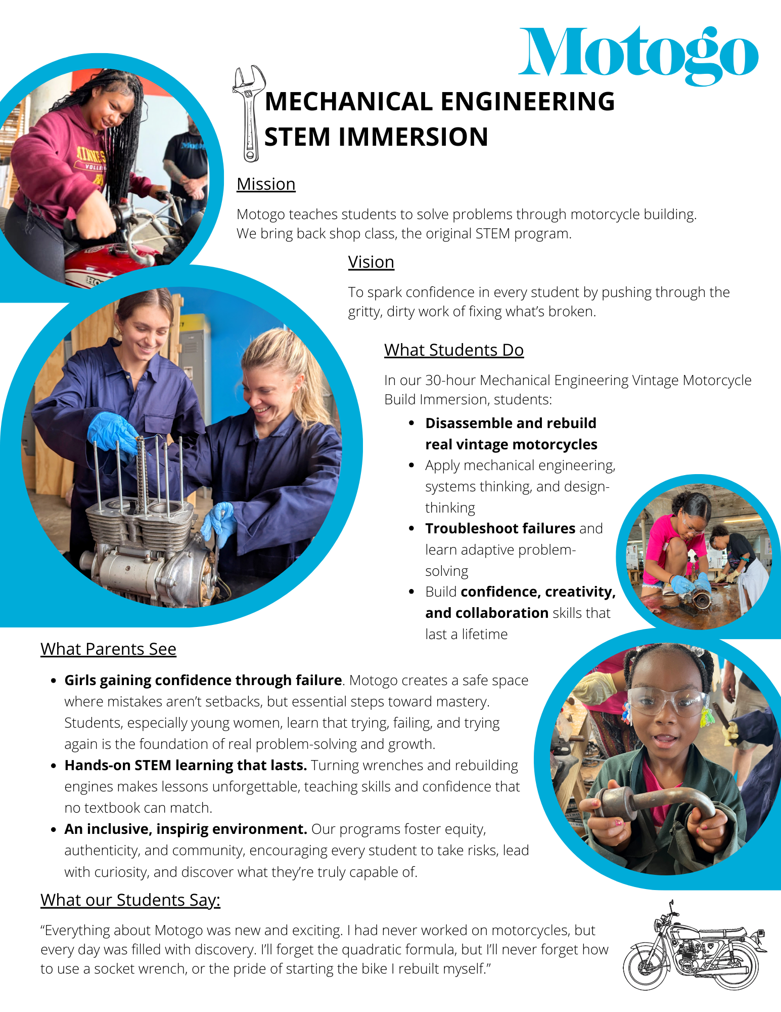 The Motogo Immersion Course creates a safe, empowering space for girls ages 12–18 to embrace the challenges—and the lessons—of failure. In this weeklong program, students work hands-on to build and rebuild a real motorcycle engine, applying mechanical skills while learning that missteps are not setbacks, but essential steps toward mastery.